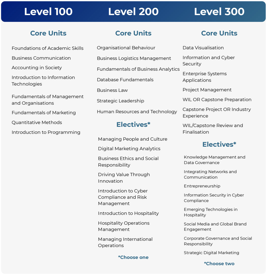 This course commences with eight (8) core units at the 100 level that provide students with a strong grounding in the knowledge, skills to move to the next level. Within the 200 level there are six (6) core units and two (2) electives. At the final 300 level, there are four (4) core units, two (2) elective units and one (1) capstone unit at the 300 level.