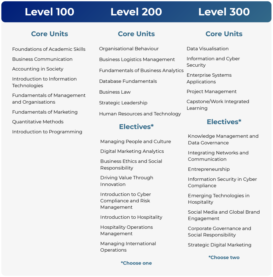 This course commences with eight (8) core units at the 100 level that provide students with a strong grounding in the knowledge, skills and application required for business and technology. Within the 200 level there are two (2) core units, five (5) major units and one (1) elective covering business and technology at the 200 level. At the final 300 level, there are four (4) major units, two (2) electives covering advanced applications and an internship option, and one (1) capstone unit at the 300 level provides students with a choice of electives in their field of interest.