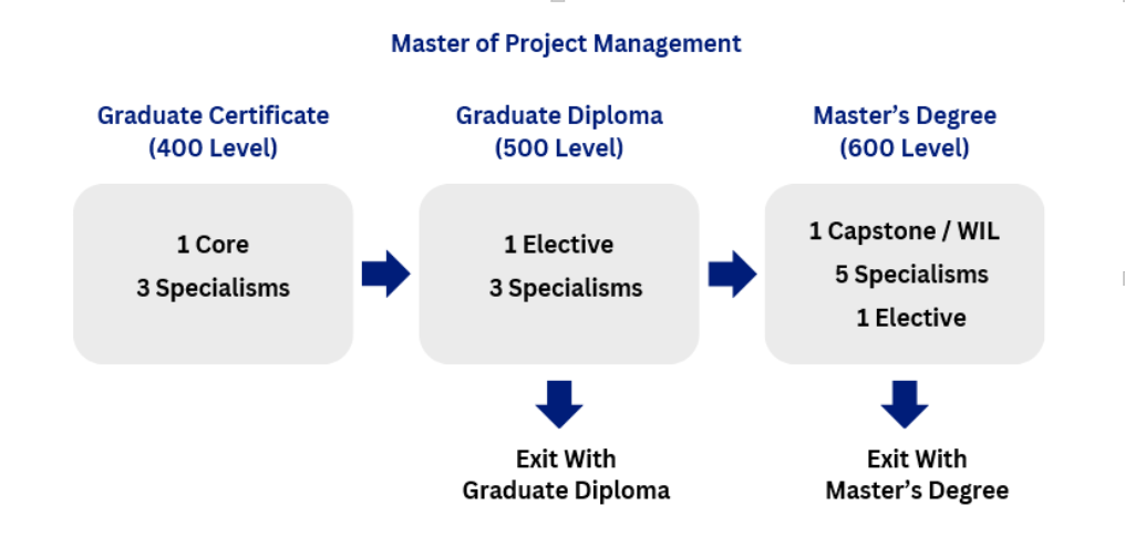 ASA's Master of Project Management, commences with four (4) units, one (1) core and three (3) specialism units at the 400 level which compromises the nested Graduate Certificate exit qualification.